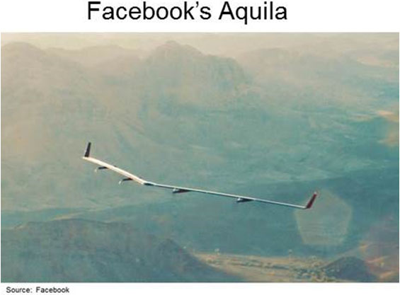 In June 2016, Facebook announced the first full-scale test flight of Aquila. The plane with a wingspan bigger than a Boeing 737 has wings made from a cured carbon fiber that is stronger than steel, but weighs about 1/3 of an electric car. Aquila flies on solar power during the day and battery power at night, with about half of the mass devoted to batteries. At 60,000 feet, Aquila’s efficient aerodynamics allows it to loiter using the power of three hairdryers (5,000 watts).